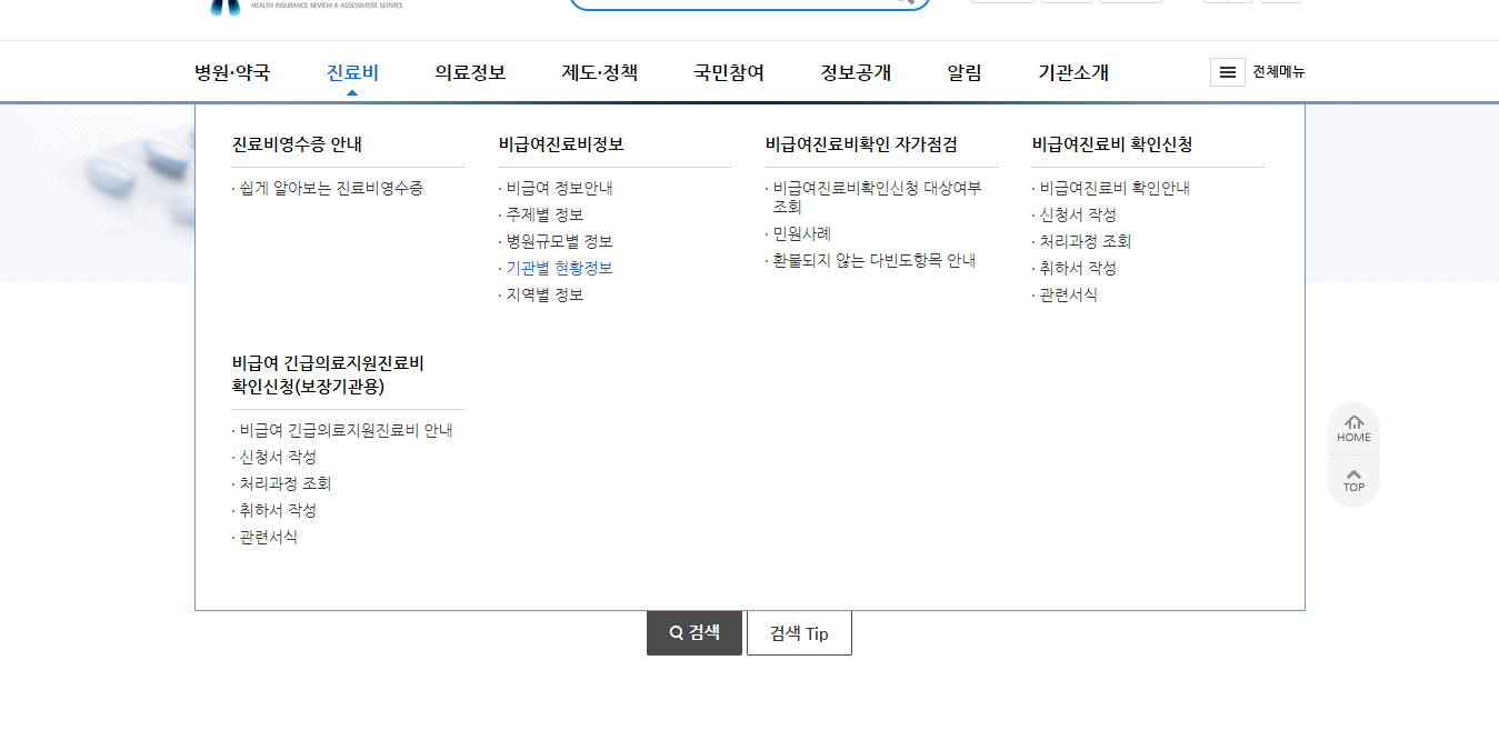 진료비 항목에서 기관별 현황 정보를 클릭하시면 아래와 같이 나오게 됩니다.