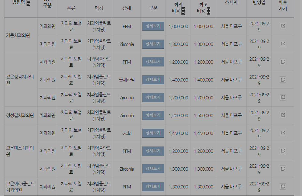 치과 병원을 클릭하시고 지역별에서 거주 중인 시군구를 선택하시면 됩니다. 이후 치과의 보철료를 클릭하시면 아래와 같은 임플란트의 최저 비용과 최대 비용 치과병원을 볼 수 있습니다.